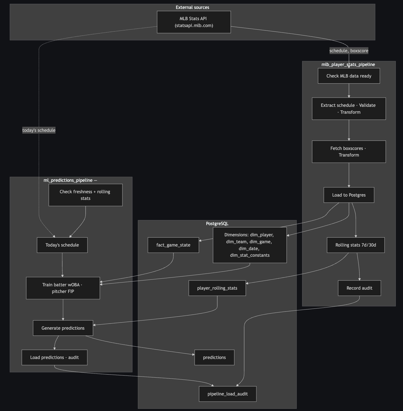 Starting with the raw MLB data, I wanted to set up an end-to-end data engineering pipeline that ingests game data, cleans it, calculates advanced metrics, then uses machine learning to predict player performance over time.